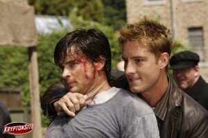 Após se separar de Green Arrow, Clark encontra Lois, que também está no prédio à procura de Chloe, ela conseguiu descobrir a localização dela roubando um pen-drive da mansão do Lex, e a pergunta que não quer calar é porque não pegou todos? Bem, Lois arruma uma arma e Clark acaba ficando pra traz como um cara normal, e isso é um Super-problema quando Green Arrow recebe uma dose da solução que controla mente e tenta arrancar de Clark onde está Lex. E ele acaba acertando uma flexa no coração do Clark, o que pra mim não me pareceu uma boa forma de interrogatório, afinal… homem morto pode falar?